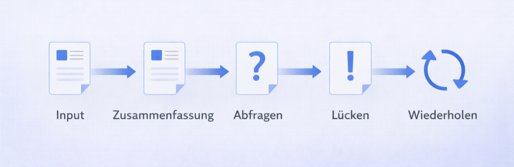3. Abfrage (8 Min): 8–12 Fragen generieren lassen und wirklich beantworten (ohne Spicken).